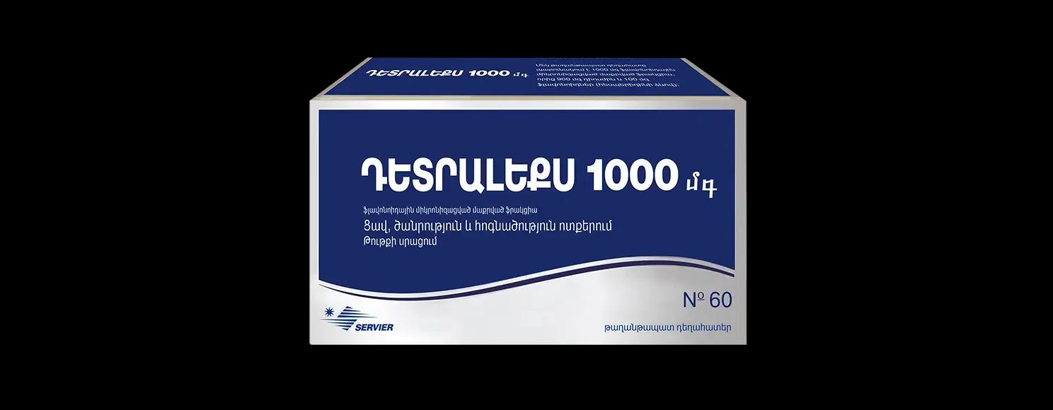 Դետրալեքս 1000: ֆլավոնոիդային միկրոնիզացված մաքրված ֆրակցիա – 1000 մգ, այդ թվում՝ դիոսմին – 90% (900 մգ), ֆլավոնոիդներ՝ հեսպերիդինի ձևով - 10% (100 մգ): Կիրառման ցուցումներ: Դետրալեքսը ցուցված է երակային և ավշային անբավարարությամբ պայմանավորված ախտանիշների (ցավ և ծանրություն ոտքերում, ոտքերի հոգնածություն և գիշերային ջղակծկումներ), թութքի սուր նոպայով պայմանավորված ֆուկցիոնալ ախտանիշների։*Կիրառման ցուցումներ, եղանակներ և դեղաչափեր: Մեծահասակների համար թույլատրելի օրական դեղաչափը 1 դեղահատն է, որը նախընտրելի է ընդունել առավոտյան՝ ուտելու ընթացքում: Թութքի նոպայի դեպքում՝ դեղաչափը կարող է հասնել մինչև 1 դեղահատ 3 անգամ օրական։ Հակացուցումներ: Դետրալեքսը հակացուցված է ակտիվ բաղադրատարրի և/կամ օժանդակ նյութերից որևէ մեկի նկատմամբ գերզգայնություն ունեցող պացիենտներին: *Կիրառման հատուկ հրահանգներ և նախազգուշացումներ: Թութքի սրացման ժամանակ Դետրալեքսի նշանակումը չի փոխարինում ուղիղաղիքային խանգարուﬓերի հատուկ բուժմանը։ Եթե ախտանիշներն արագ չեն անհետանում, ապա անհրաժեշտ է իրականացնել պրոկտոլոգիական հետազոտություն և վերանայել բուժումը: Փոխազդեցությունն այլ դեղաﬕջոցների հետ՝ չի արձանագրվել։ Կիրառումը հղիության և կրծքով կերակրելու շրջանում ցանկալի չէ Դետրալեքս դեղը օգտագործել *Կողմնակի ազդեցություններ: Հաճախակի թեթև (ոչ ծանր) կողմնակի ազդեցություններ փորլուծություն, մարսողության խանգարումներ, սրտխառնոց, փսխում: Ոչ հաճախ՝ կոլիտներ։ Հազվադեպ՝ գլխապտույտ, գլխացավ, ընդհանուր թուլություն ցանավորում, քոր, եղնջացան։ Անհայտ հաճախականությամբ՝ որովայնային ցավ, դեմքի, լեզվի, կոպերի անգիոայտուց: Կվինկեի այտուցի եզակի դեպքեր: *Դեղաբանական հատկություններ: Դետրալեքսը ազդում է երակային արյան վերադարձն ապահովող համակարգի վրա, նվազեցնում է երակների լայնացումն ու արյան կանգը, կարգավորում է մազանոթների թափանցելիությունը, բարձրացնում է դրանց դիմադրողականությունը: